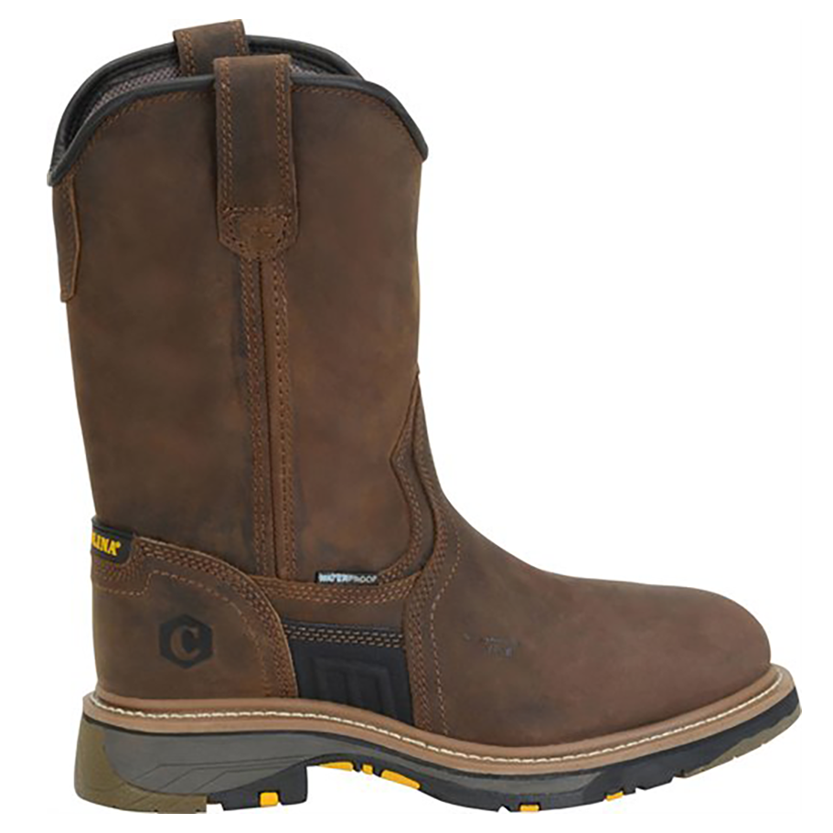 Composite toe work boots designed for durability and protection, the Men's 10" Wellington Pull-On Waterproof Ranch Style boots deliver safety and comfort for demanding jobs. These waterproof work boots feature a tan crazy horse leather upper that offers rugged durability, while the composite safety toe cap protects against impact without adding extra weight. Ideal for ranch work and heavy-duty tasks, these 10 inch work boots provide essential support and protection throughout long shifts.